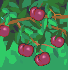 Vlakbie de plek woar wie zeten haren te vissen ston, aan de overkaante van t wotter, n aarbaidershoeske dat al n tiedje leeg ston. Wie wuzzen dat doar n poar jongens, dij ook bie ons op schoule zaten, woond haren. Der stonnen n stuk of wat bomen bie woar, om dij tied van t joar, proemen aan zaten. Van dij grote lekkere aaierproemen. Ze laagden ons van vèren al tou en hou laanger wie der noar keken, hou groter ze leken en hou meer zin wie derin kregen. Viske raive wör weer mit n endje taauw aan de fietse bonden en wie der hen, op noar de proemen. Wie mozzen n mooi endje terog en din bie n boerderij over n brugge. Toun wie der noa n minuut of tiene fietsen wazzen, gooiden wie de fietsen hen en luipen noar de boom mit de mooiste en dikste proemen.