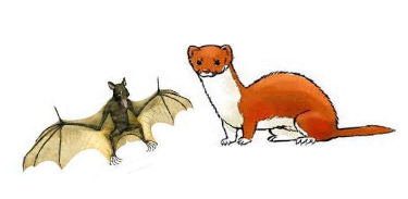 n Fleddermoes dij op grond deel kwam en vongen wer deur n wiezeltje, smeekte om zien levent te spoaren. Wiezeltje waaigerde dat, omreden hai was van noatuur oet vijand van aal vogels. Fleddermoes zee tegen wiezeltje, dat e gain vogel was mor n moes. Dou wiezel dat heurde lait hai fleddermoes goan. n Zetje loater vil fleddermoes vannijs omdeel op grond en wer dismoal vongen deur n aandere wiezel. Ook dij wer smeken doan hom nait op te vreten. Dit wiezeltje zee dat e n biezundere vijandschop noar moezen tou haar en hom opvreten wol. Fleddermoes verzekerde hom dat e gain moes was mor n vogel, omreden hai kon ja vlaigen.