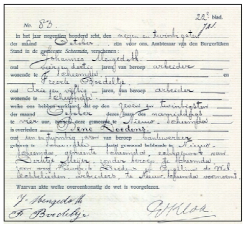 De gegevens binnen bekind, moar schaande genog binnen der van de geboorteakten van Winschoot nog gain oafbeeldens op ‘Alle Groningers’ zet. Overliedensakte oet Scheemde van zien voader, dij ook in 1908 oet tied kwam, kin k wel bekieken. t Traauwregister duurt 75 joar veur je der in kieken maggen en de registers van minsen dij oet tied kommen binnen mag je noa 50 joar al inkieken. t Bevolkingsregister tot 1938 is openboar moar nait altied via t internet te bekieken, zeker nait van klaine gemainten. Din mout je noar t gemaintehoes. Moar van grote ploatsen as Amsterdam en Alkmaar b.v. binnen ze wel op internet te vinden.