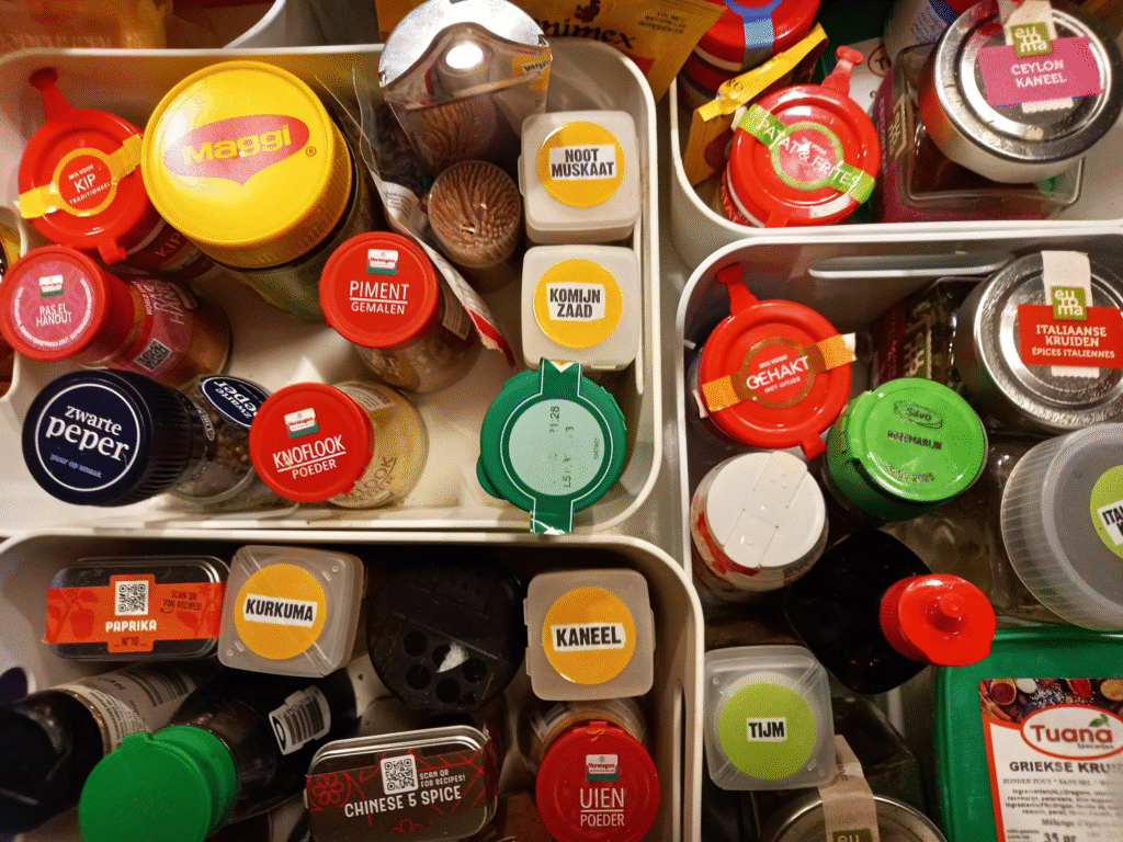 De kruden. Mit tijm bin k snel kloar, want fleskes stoan mooi op alfabetische volgorde. Bie piment – nog nooit van heurd – roak ik de weg volledeg kwiet. Noa peper en peterselie zol toch aiglieks piment volgen mouten, mor aal wa’k zai, gain piment.