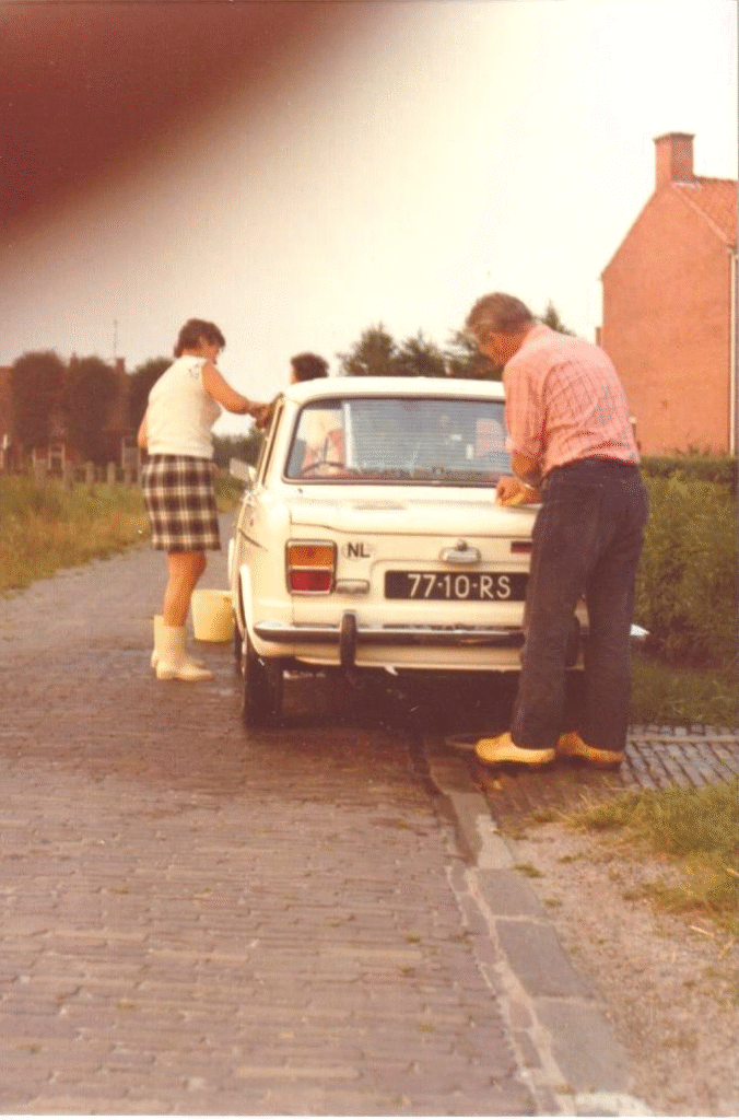 Mor t alleraargste von k, dat t lutje Simcaatje om de zoveul weke mit wriefwas en poetsdouk onder handen nomen wuir. Poetsen tot e weer glom as n ekkel. t Waren stoere tieden en t beeld van n stroat vol mìnsen dij in t zulfde gareel luipen, staait mie nog helder veur ogen. k Mag aannemen, dat tegenzin in autopoetsen, het onverbiddelk mouten, doar zien oorsprong vonden het.