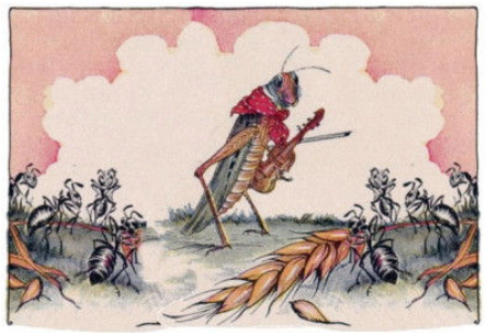 Mieghommels wazzen op n schiere winterdag drok bezeg groankorrels te dreugen dij zai ien zummer sprokkeld haren. Sprinkhoan dij sikkom verhongerde, sleepte zuk veurbie en smeekte om n beetje vreten. Mieghommels vrougen hom woarom of hai ien zummer gain winterveurroad verzoameld haar. Sprinkhoan zee dat e doarveur gain tied had haar omreden hai was dou haile doagen aan t zingen west. Dou zeden mieghommels dat hai, as e stom genog was om ien zummer mor haile doagen te kwelen, ien wienter mor mit lege moag noar bèr daanzen mos.